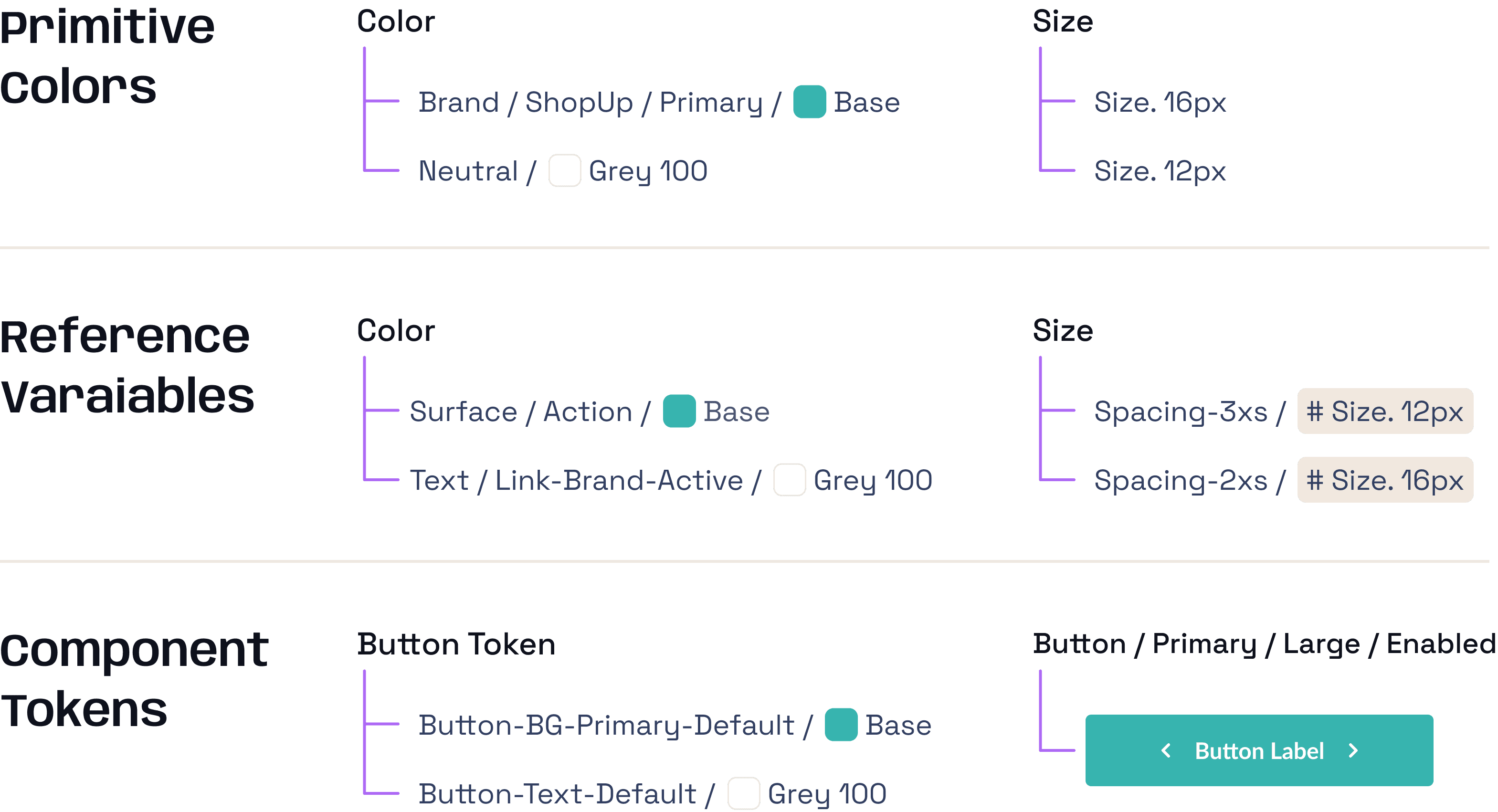 We created foundational variables for size and color, which would be referenced to build the components.