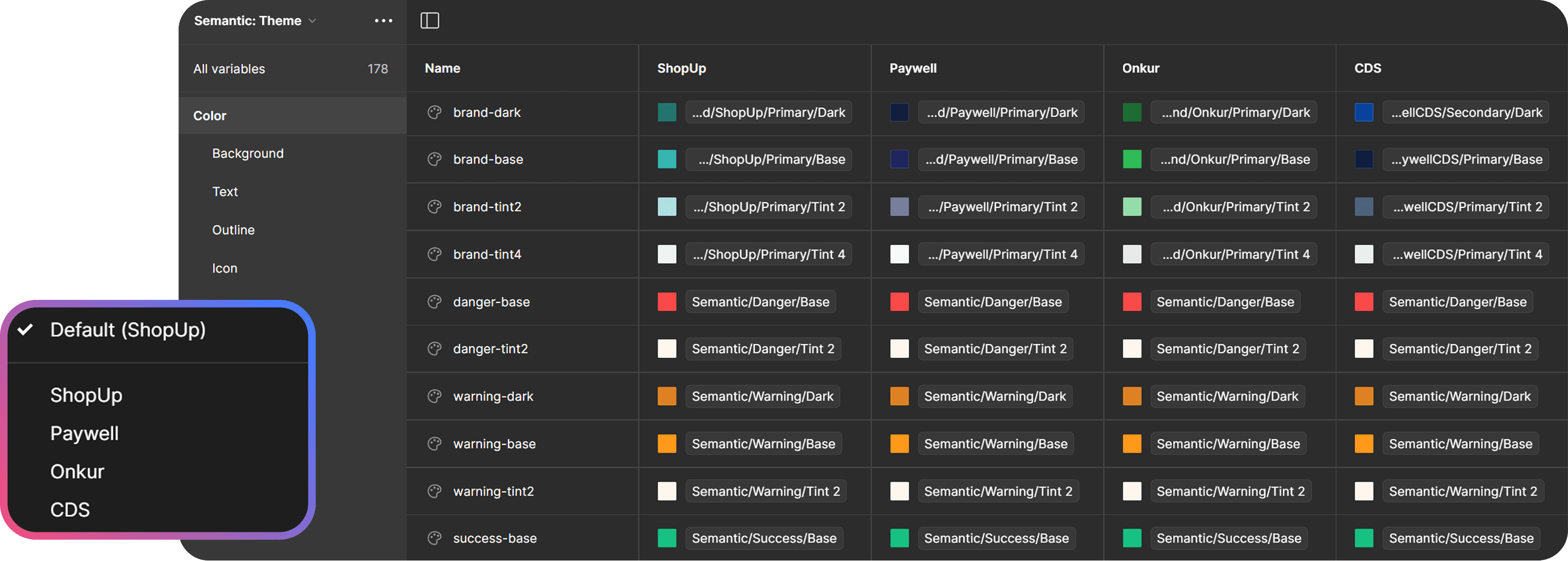One system, all brands. Designers select their brand mode, and components adapt with the right colors automatically.
